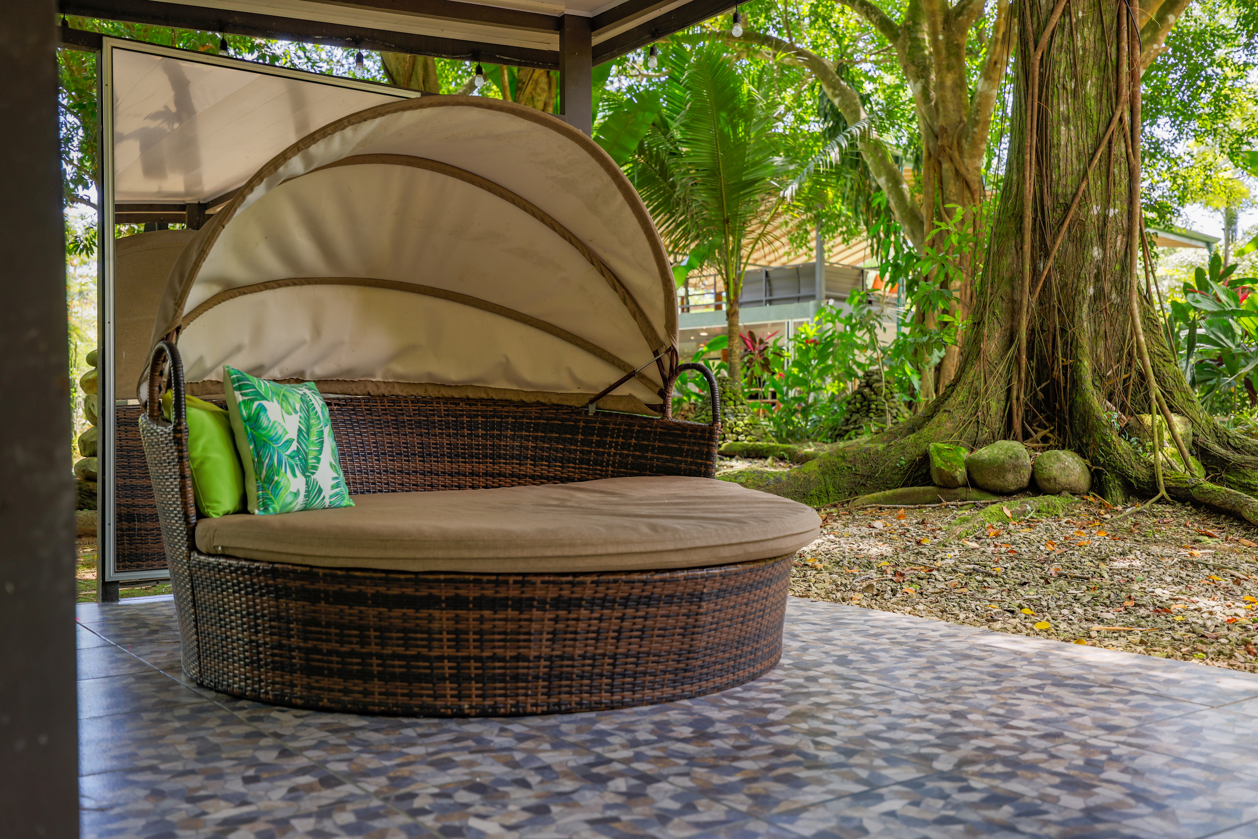 Practice yoga on the expansive open-air 360° yoga deck, equipped with mats, blocks, straps, bolsters, blankets, and aerial yoga slings. The space invites you to deepen your practice amidst the sights and sounds of the tropical rainforest. Refresh yourself in the chemical-free saltwater pool, surrounded by tropical beauty.